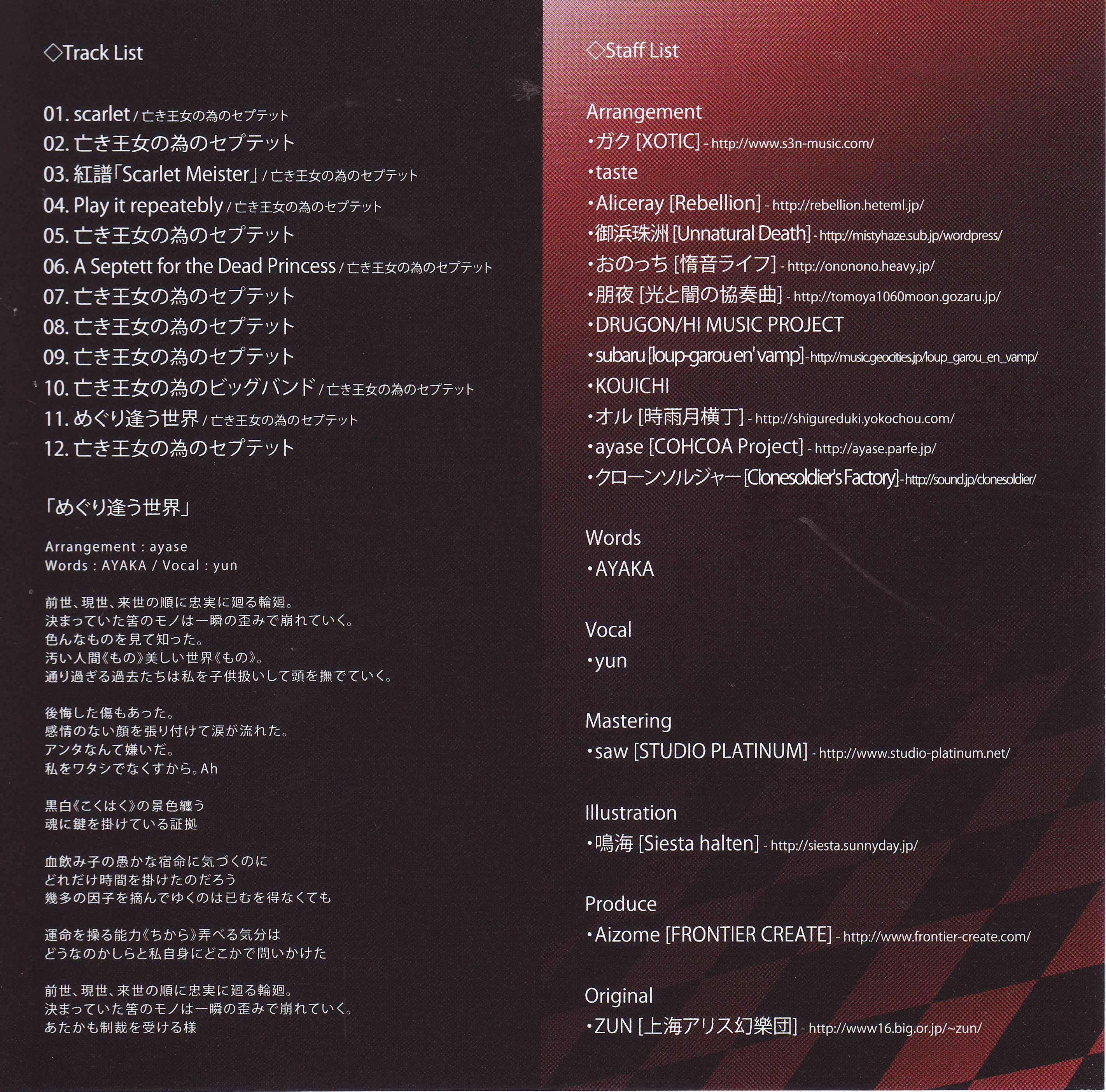 | - | (06) [朋夜] A Septett for the Dead Princess.flac | 16964159 | | =NeutraL= | SCARLET MAGIC | 6 | 朋夜 | A Septett for the Dead Princess | 82 | 227 | 582 | 594 | | flac | | | flac | 2025-06-14 21:06:32 |