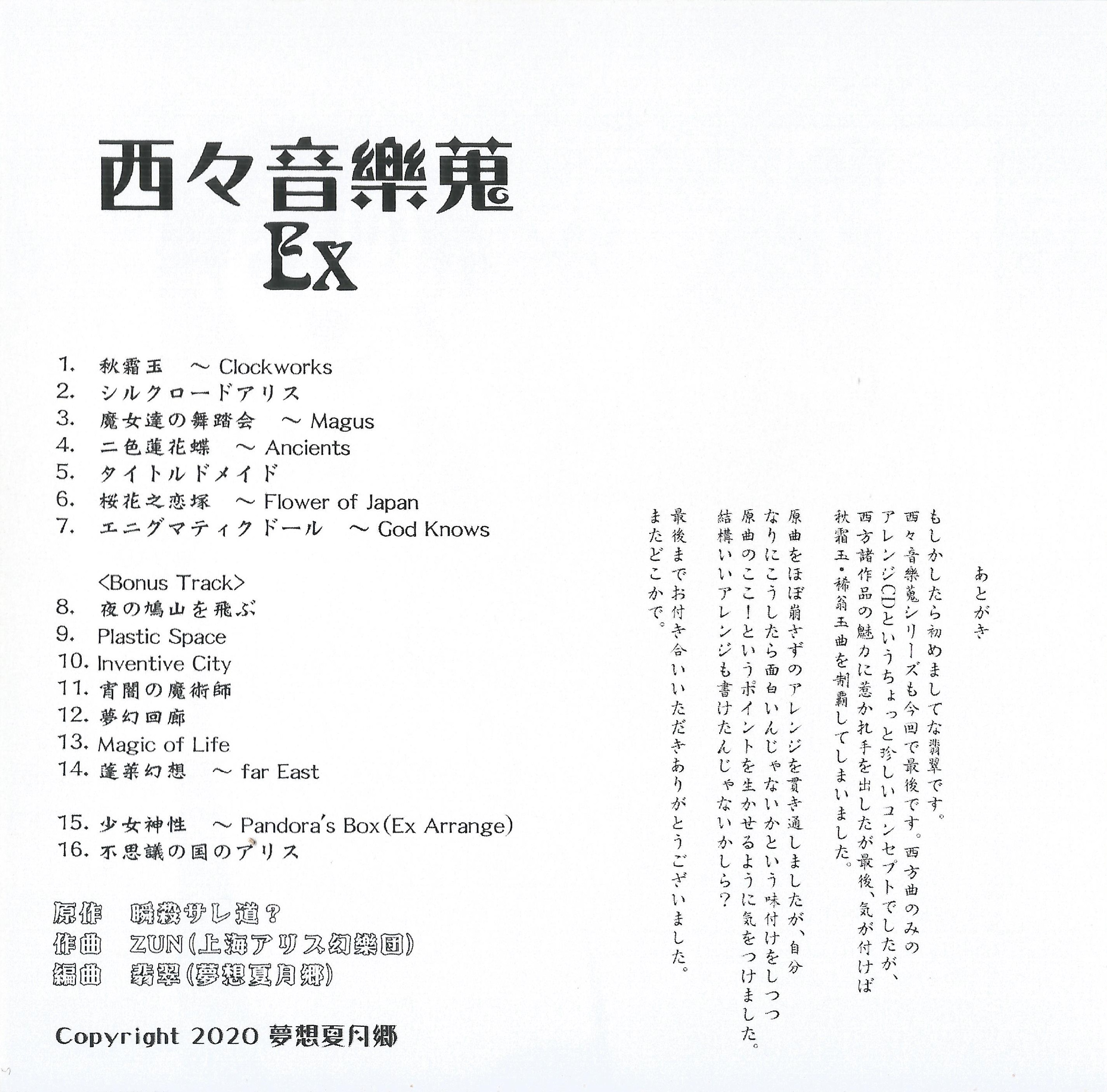 | - | (09) [翡翠] Plastic Space.flac | 21327048 | | 夢想夏月郷 | 西々音樂蒐Ex | 9 | 翡翠 | Plastic Space | 105 | 150 | 1106 | 1126 | | flac | | | flac | 2025-11-03 10:04:37 |