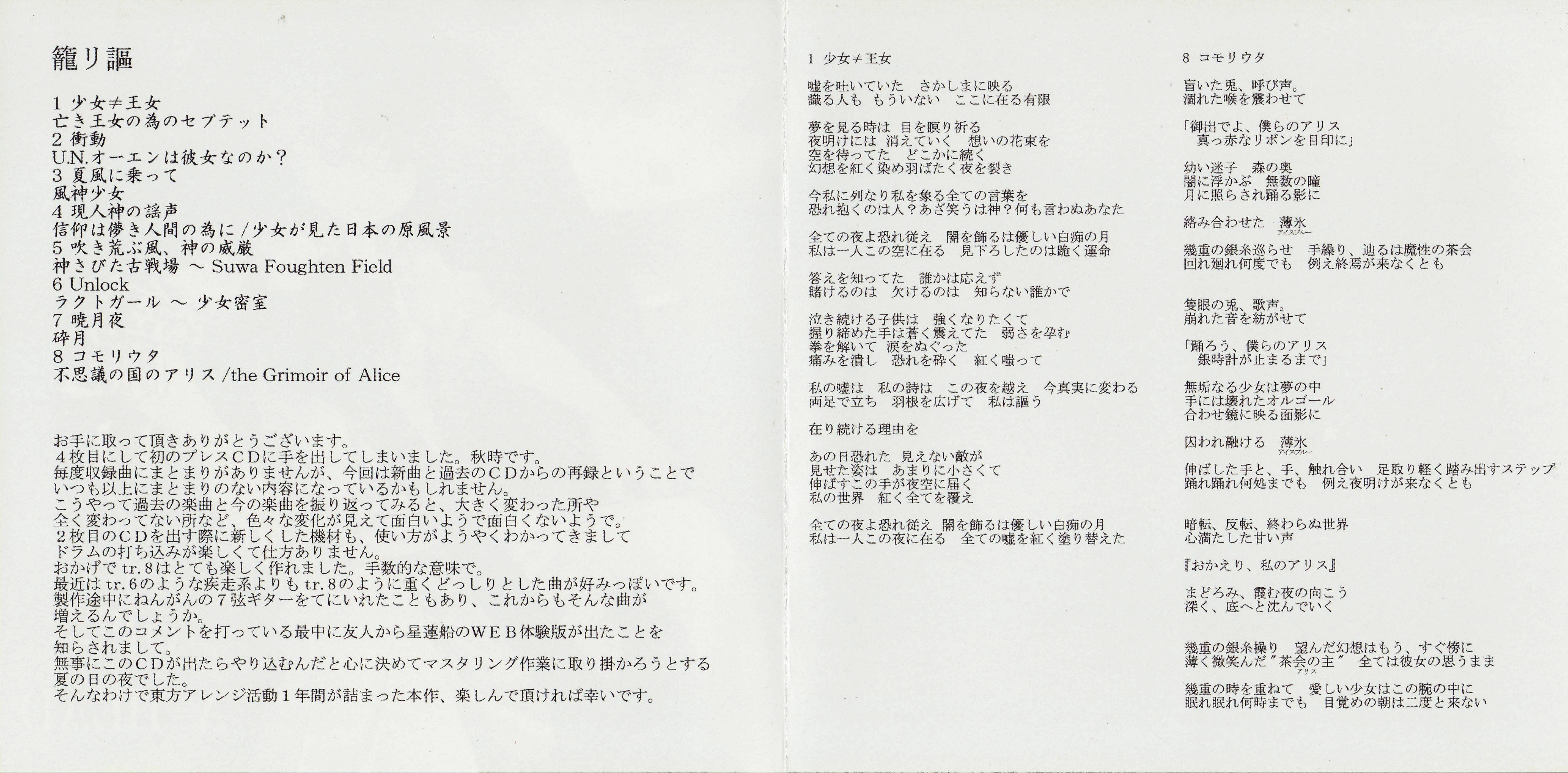 | - | (06) [秋時] Unlock.flac | 31503076 | A-HEAD | 籠リ謳 | 6 | 秋時 | Unlock | 189 | 243 | 1012 | 1034 | flac | flac | 2025-07-06 00:14:45 | ||||